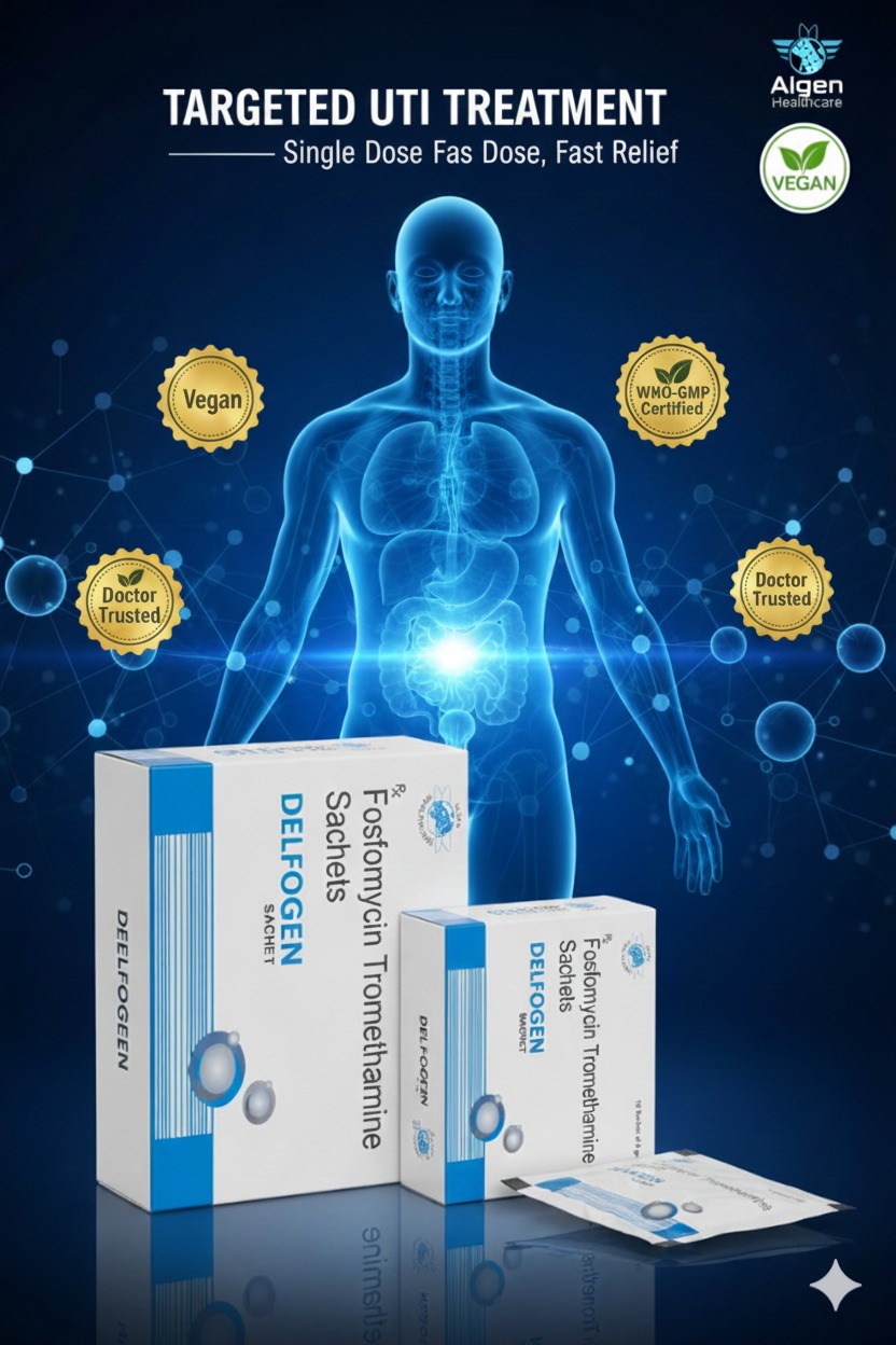 DELFOGEN Sachet is a single-dose Fosfomycin Tromethamine formulation used for the effective treatment of uncomplicated urinary tract infections (UTIs). It provides fast relief with targeted antibacterial action against common UTI-causing pathogens. Manufactured by WHO-GMP Certified Algen Healthcare, it ensures high quality, safety, and therapeutic reliability.